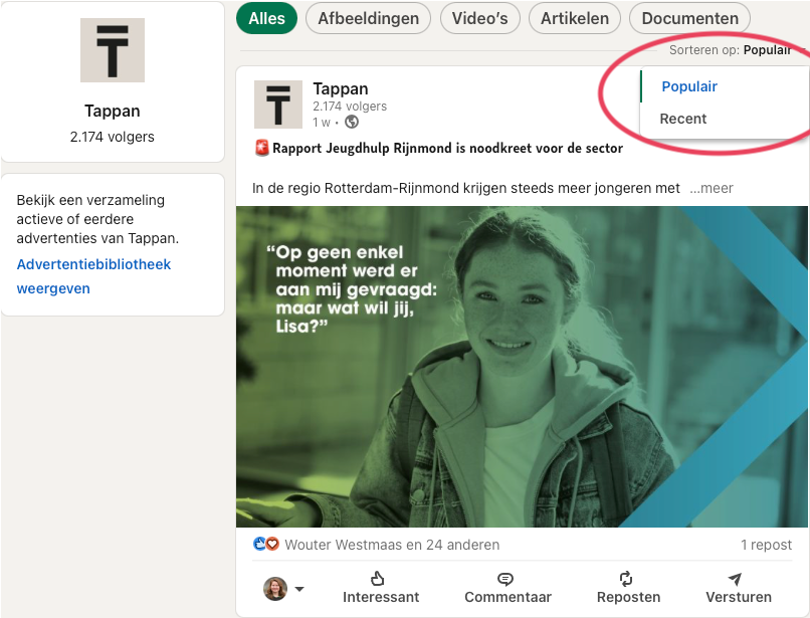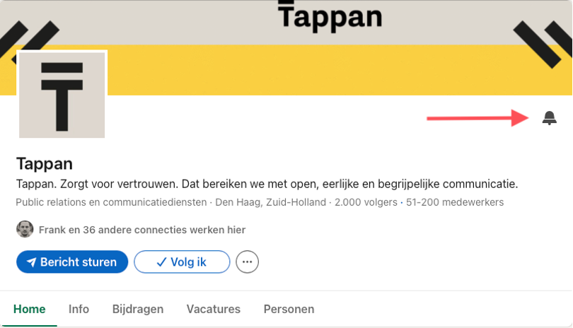 Bedrijven kunnen eenzelfde soort profiel vullen, maar dan met bedrijfsinformatie. Dit is dé plek om je als organisatie te profileren, meer informatie te delen over je bedrijf en een link naar je website op te nemen. Volgers van de pagina kunnen de bijdragen van een bedrijfspagina makkelijk delen. Maar wist je dat bijdragen vanuit een bedrijfsprofiel slechts 6% van de volgers bereiken, terwijl bijdragen vanuit jouw persoonlijke profiel 50-100% van je volgers kunnen bereiken? Het algoritme geeft namelijk de voorkeur aan bijdragen waar mensen een centrale rol in spelen.